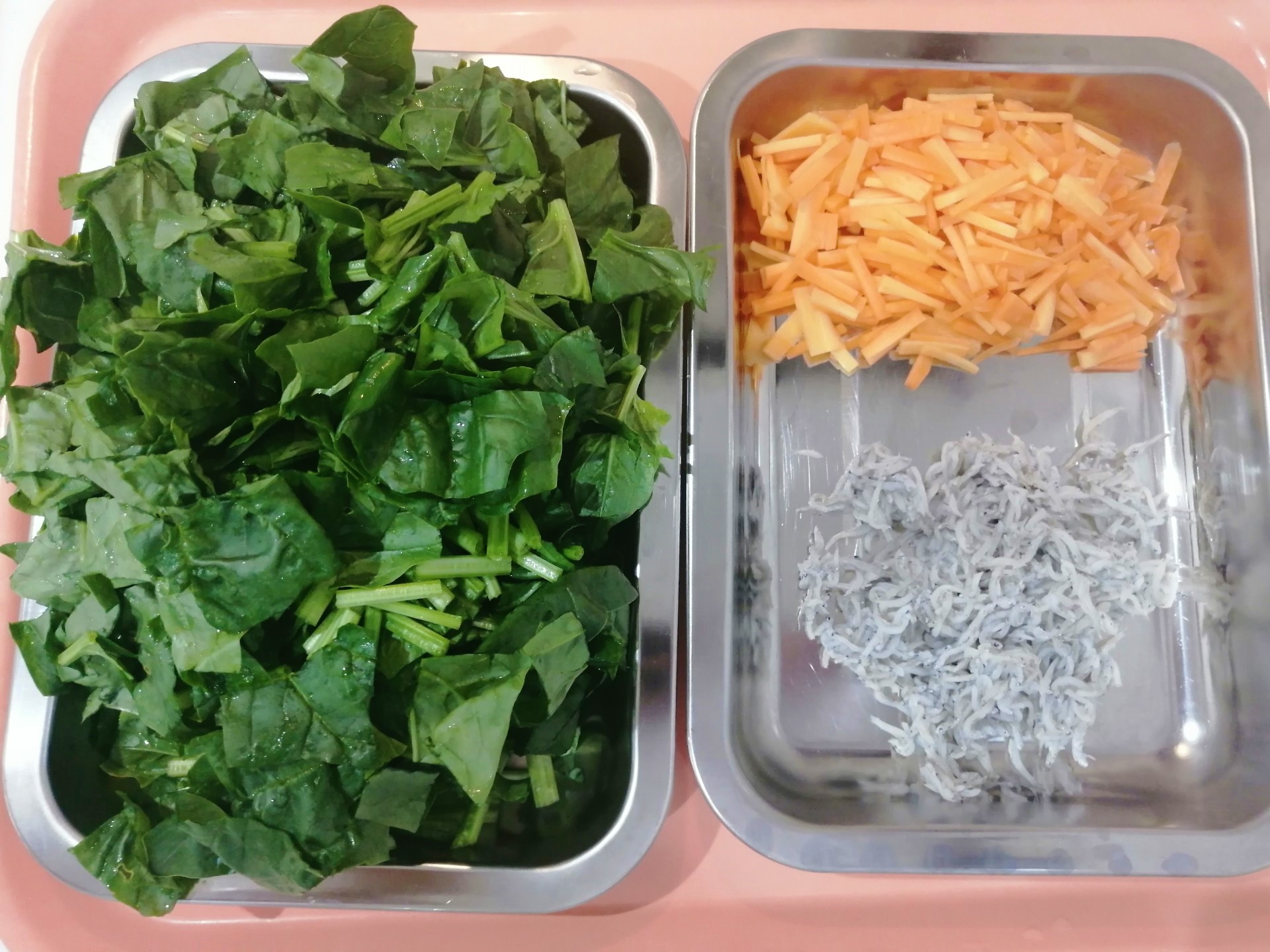 | ①ほうれん草をざく切り、人参は短冊切りorいちょう切りにする。 |  |