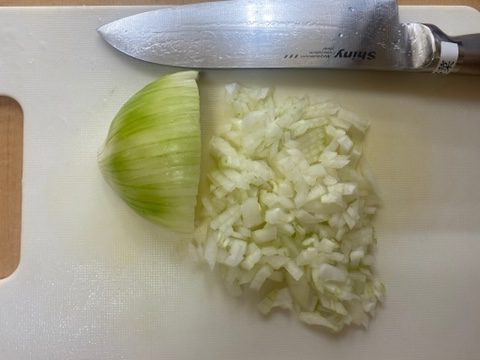 | ①玉ねぎをみじん切り、じゃが芋を3cm大に切る。 | ![]() |