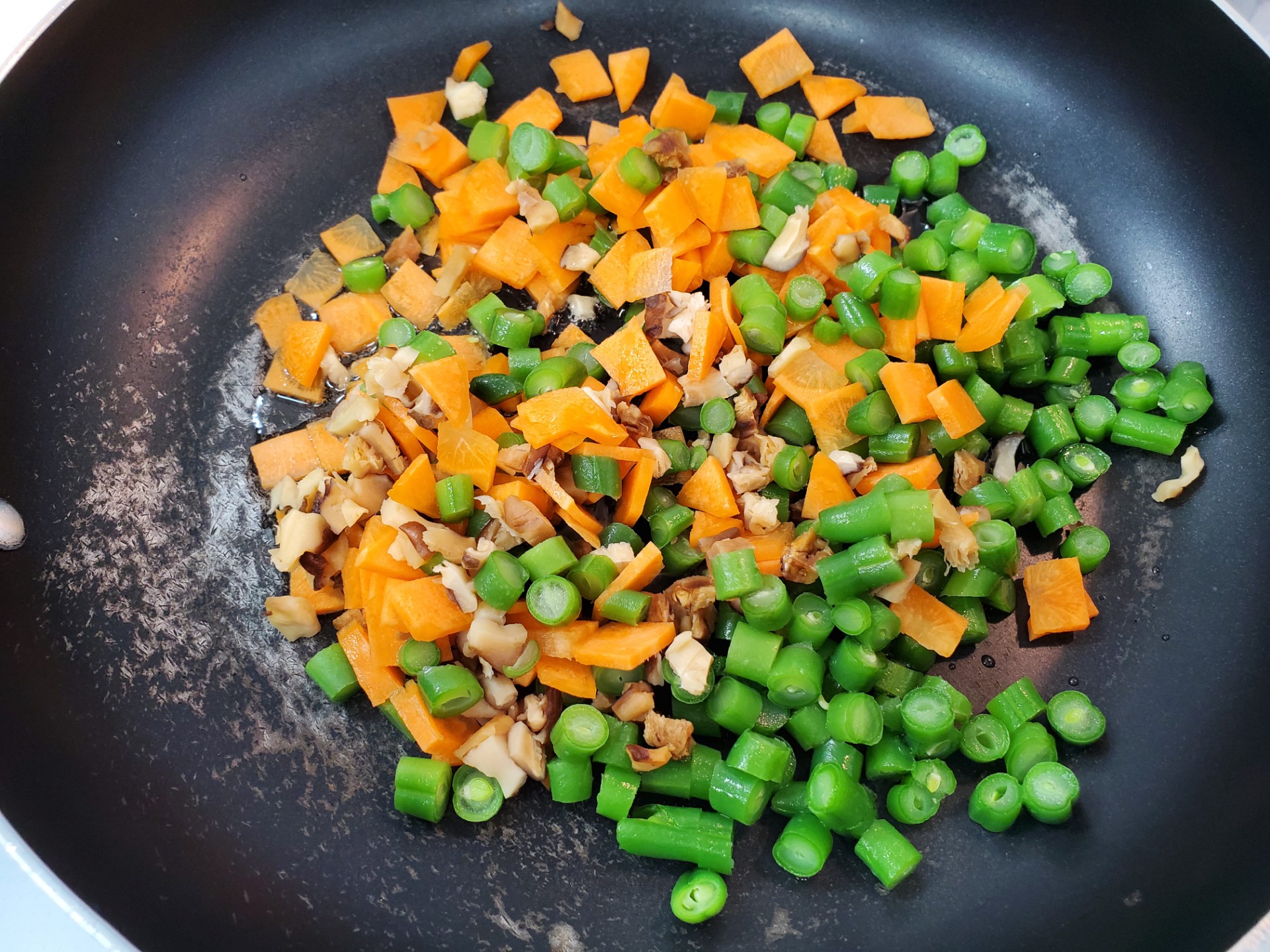 炒り豆腐 PDF 印刷 豆腐はレンジで水切り簡単!ヘルシーでおいしい炒り豆腐です。 コース:副菜 材料 木綿豆腐300g(1丁)いんげん100g玉ねぎ100g(1/2個)人参100g(1/2本)干シイタケ3g砂糖10g(大さじ1)醤油10g(小さじ2)みりん風調味料10g(小さじ2)だし汁適 作り方 ①いんげんは1cm大、玉ねぎは薄切り、人参は細切り、干シイタケはお湯で戻し1cm大に切る。玉ねぎ、人参はレンジで数分加熱しておく。 木綿豆腐はキッチンペーパーに包み、レンジで3分程度加熱し水切りする。 ②野菜を炒める。③調味料、水切りした木綿豆腐を入れ、木べらなどで潰しながら炒める。④数分炒めて完成。 投稿ナビゲーション 前の記事魚の煮付け次の記事パンプキンパイ 2021年4月27日 nukumori_master 副菜