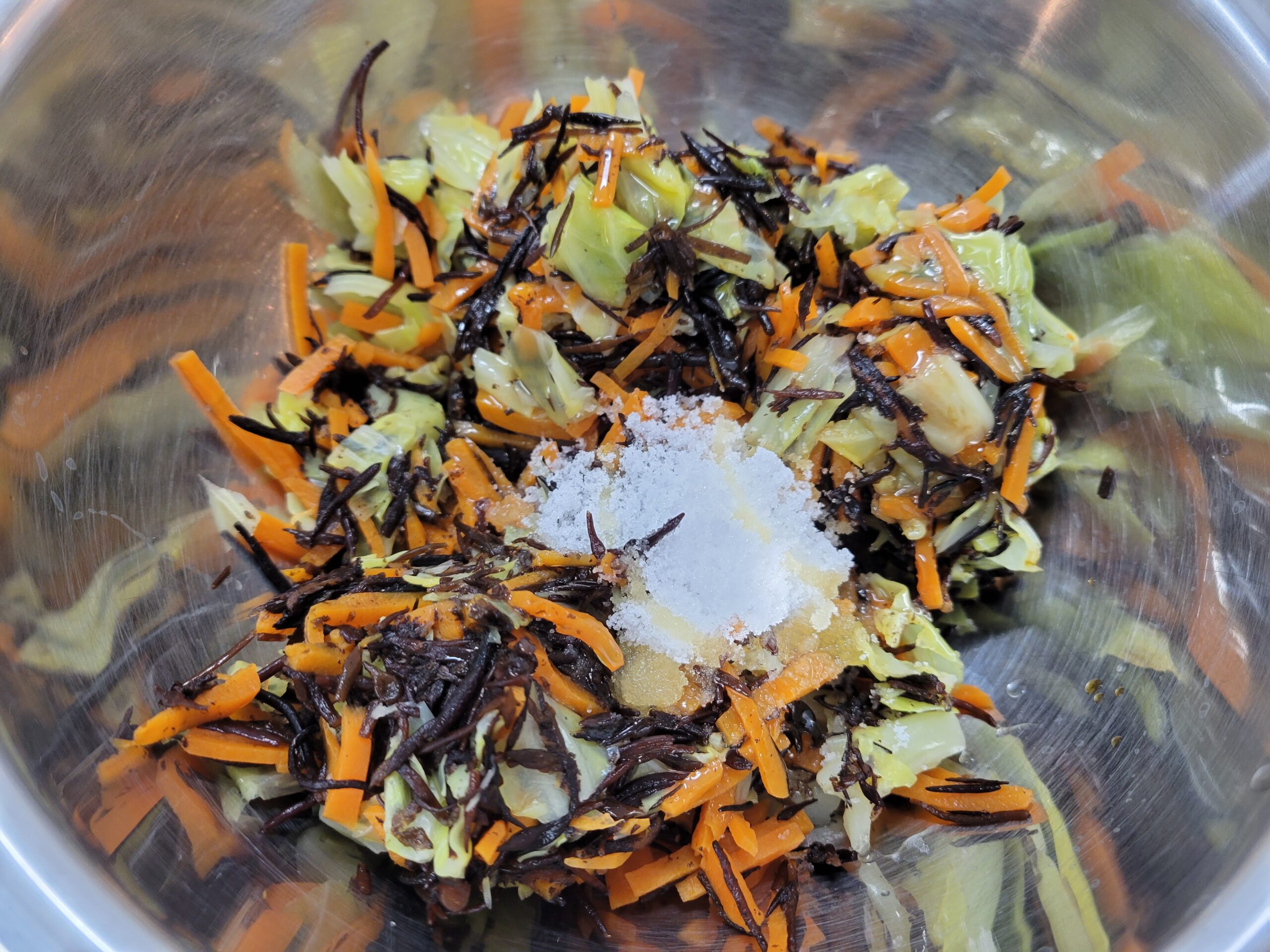 ①人参を千切り、キャベツをざく切り、ひじきをお湯で戻しておく。