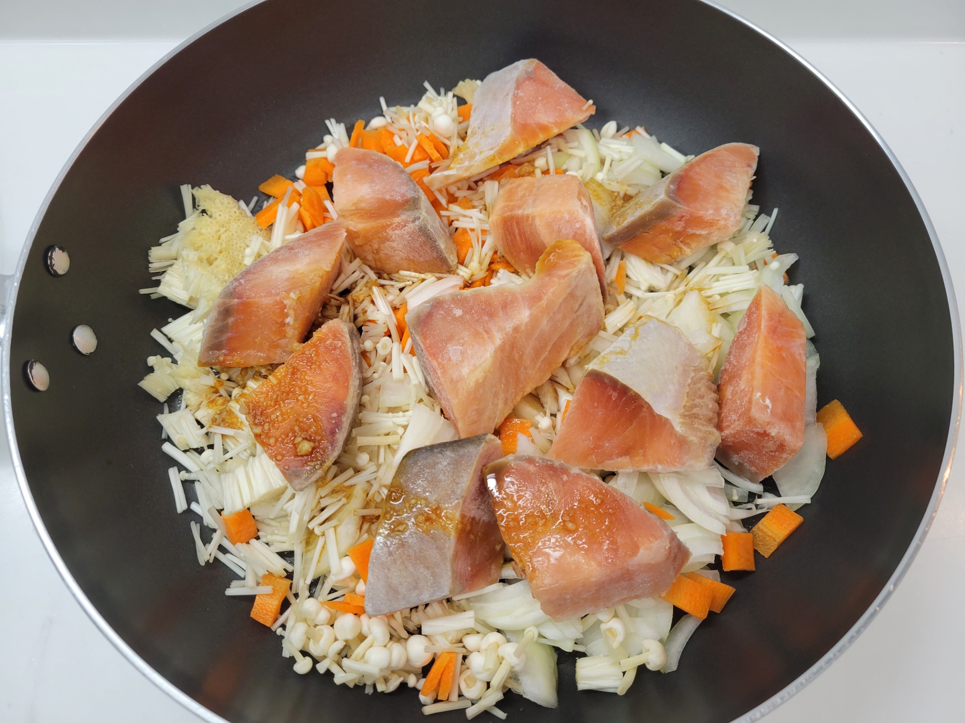 ①鮭は適当な大きさに切る。玉ねぎは薄切り、人参は短冊切り、えのきは1cmほどに切る。