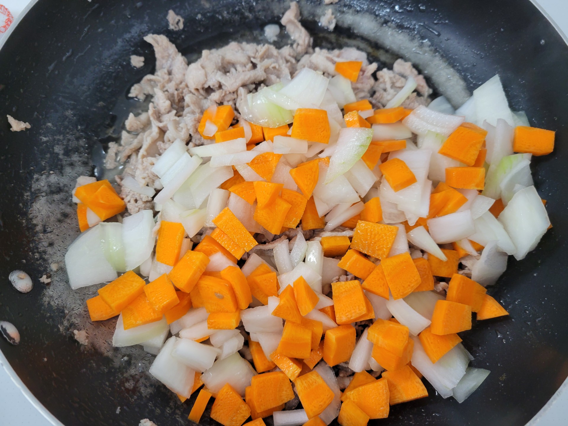 ハッシュドポーク PDF 印刷 コース:主食 材料 豚もも肉200g人参100g玉ねぎ100gしめじ100g小麦粉10gトマト缶100gケッチャップ10gウスターソース5gコンソメ2g砂糖10g醬油10g炒め油5g 作り方 ①豚肉を食べやすい大きさに切り、玉ねぎはスライス、人参はいちょう切り しめじは細かくほぐしておく。②フライパンに油をひき、豚肉、玉ねぎ、人参、しめじの順に炒め、野菜がしんなりしてきたら 小麦粉を少しずつ入れ、だまにならない様になじませる。③小麦粉が全体に行き渡ったら、トマト缶 調味料を入れ、弱火で10分程煮込む。④汁気が出てきて、とろみが出てきたら火を止める。⑤ご飯にかけて完成。 投稿ナビゲーション 前の記事ココアクッキー次の記事きな粉おにぎり 2024年5月30日 nukumori_master 主食