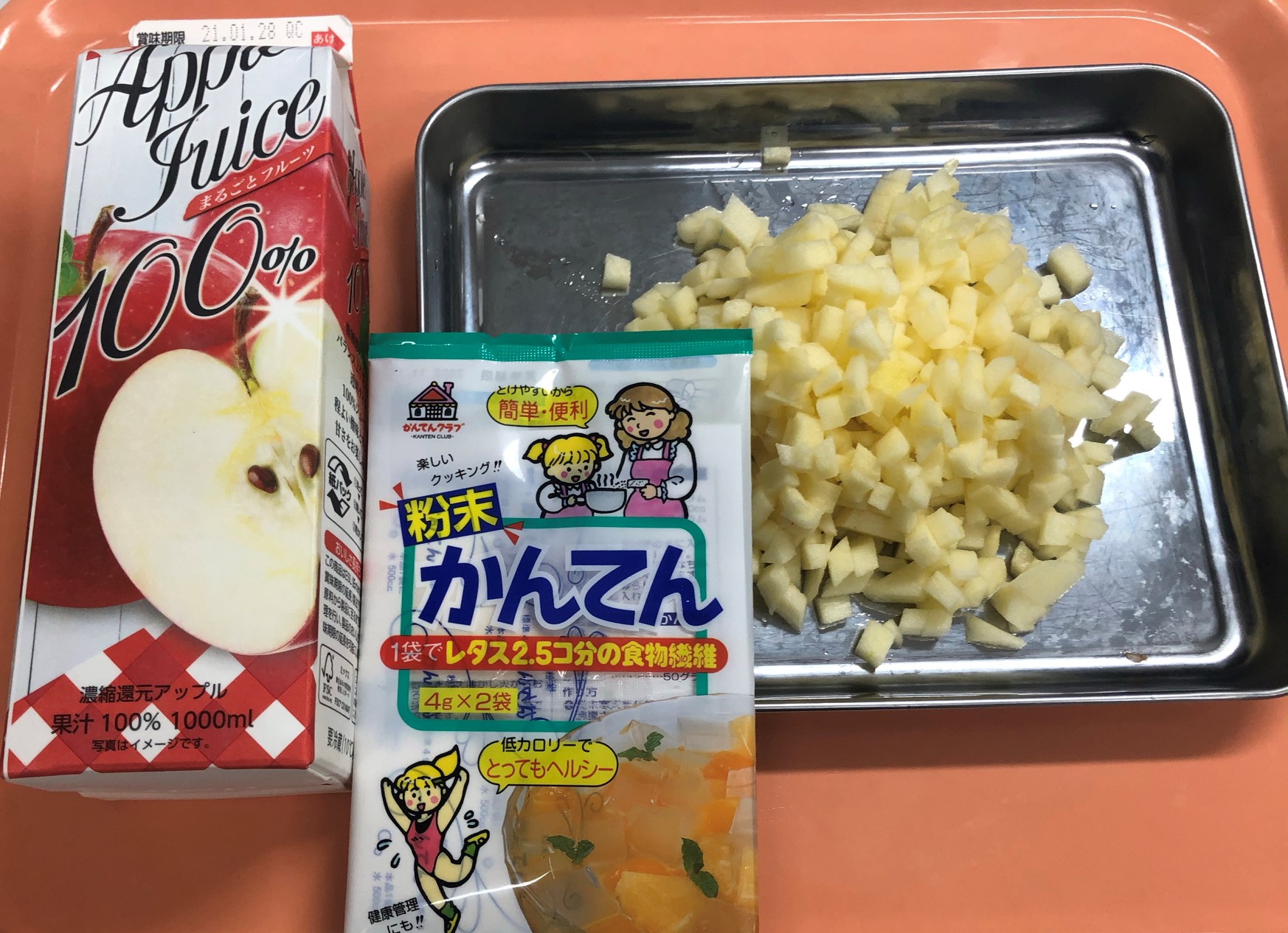 りんごゼリー PDF 印刷 シャキシャキりんごの簡単りんごゼリーです! コース:おやつ 調理時間:15分 材料 (10人前) りんご200g粉寒天3gりんごジュース500㏄ 作り方 ①リンゴをいちょう切りor食べやすい大きさに切る。②鍋にりんごジュースと寒天を入れる。 寒天を混ぜて溶かし、火にかける。③沸いたらりんごを加え、3分程度加熱する。④粗熱を取り、入れ物に流し入れ冷やし固める。 ⑤お皿に盛り付け、完成。 ※離乳食はクラッシュゼリーで 投稿ナビゲーション 前の記事小松菜のおかか和え次の記事ハンバーグ 2025年2月13日 nukumori_master おやつ