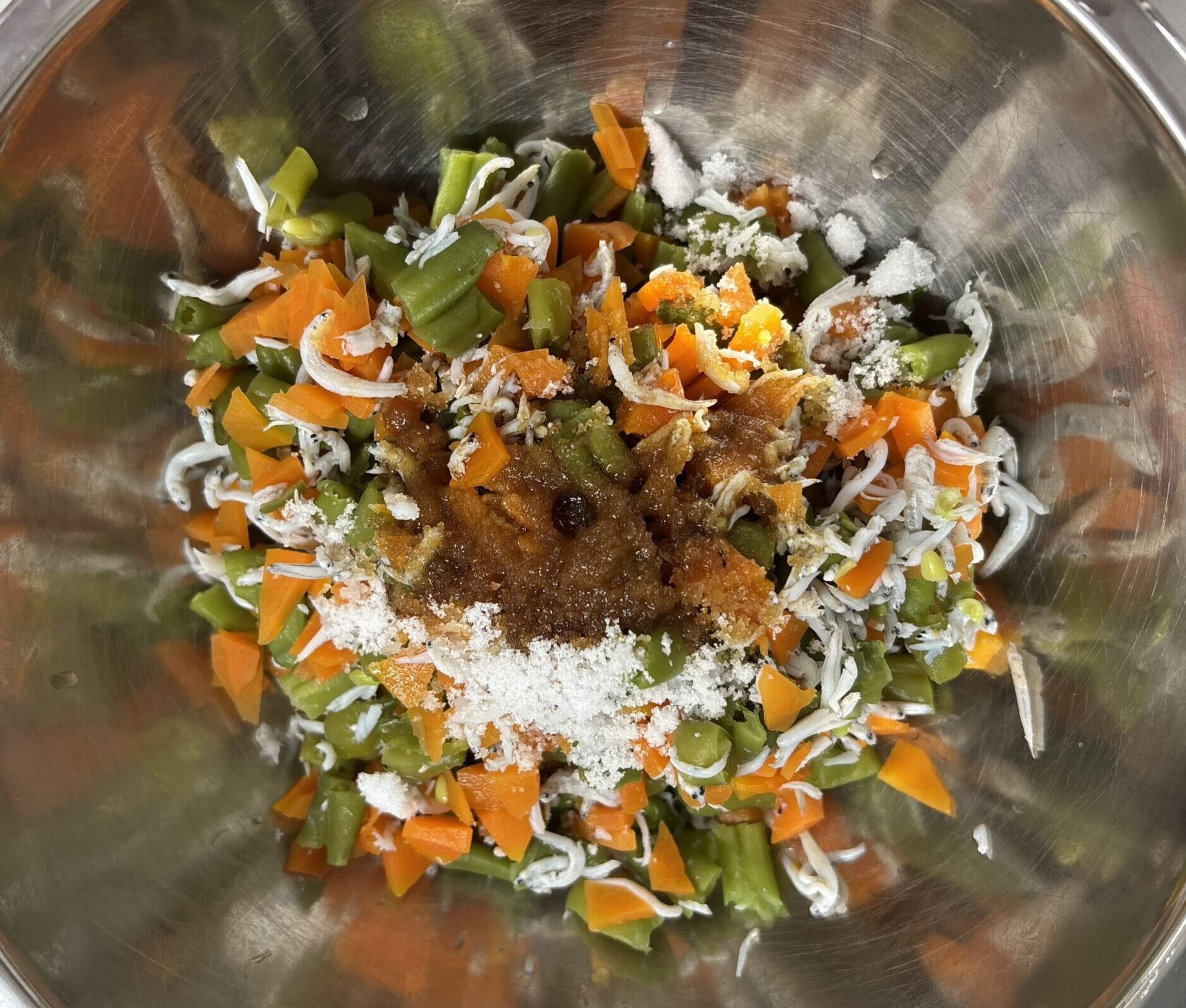 いんげんのしらす和え PDF 印刷 しらすと好みの野菜を茹でて和えるだけ♪カルシウム豊富な簡単副菜です コース:副菜 調理時間:15分 材料 (10人前) いんげん200g人参100gしらす50g砂糖10g醤油10g 作り方 ①いんげんを2㎝幅、人参をいちょう切りにする。②人参、いんげん、しらすの順に茹で、ザルにあげて流水で冷却する。③軽く絞って水気を切り、調味料を加えて混ぜ合わせる。④お皿に盛り付けて完成。※離乳食はだし汁で煮る 投稿ナビゲーション 前の記事きつねおにぎり次の記事豚丼 2025年3月1日 nukumori_master 副菜
